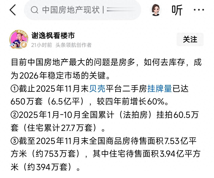 如上图所示,我们可以清楚的看到,截止2025年的11月末,从贝壳平台了解到,全国的二手房挂牌量已经达到了650万套,和深。年前相比,增长了60%。