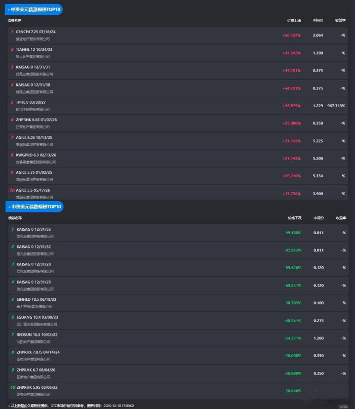 12月18日,中资美元债涨跌幅榜TOP10如下: